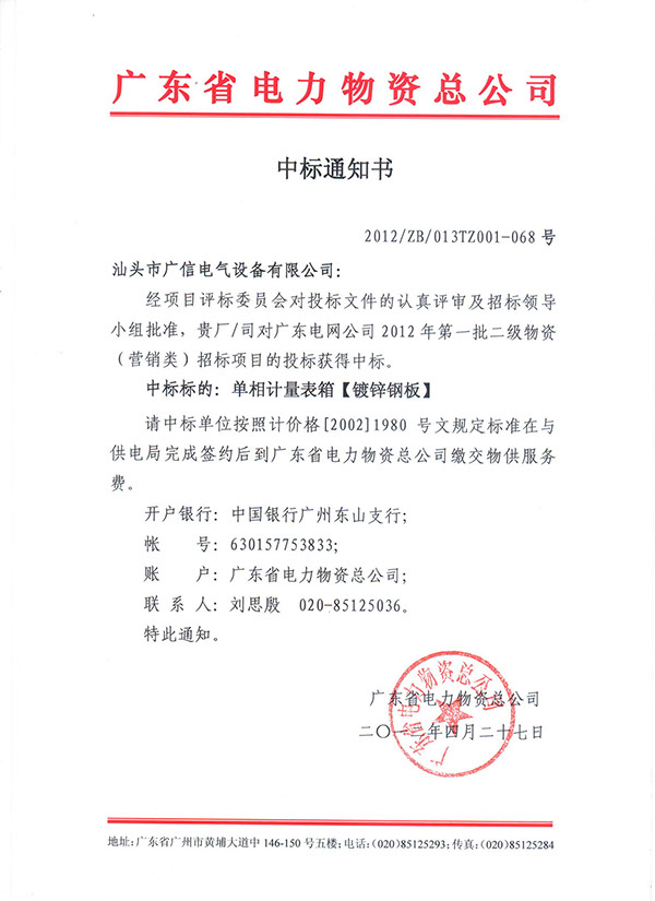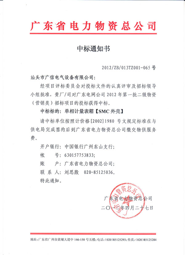 我公司參加廣東電網公司2012年第一批二級物資(營銷類)招標項目,就單相計量表箱投標項目獲得了評標專家組的一致認可,合理的價格,優質的產品和渠道,完善的服務體系是我們勝出的理由,尤其是近幾年來我們的銷售與服務得到更多用戶的好評,良好的產品也為我們的中標做了一個良好鋪墊。