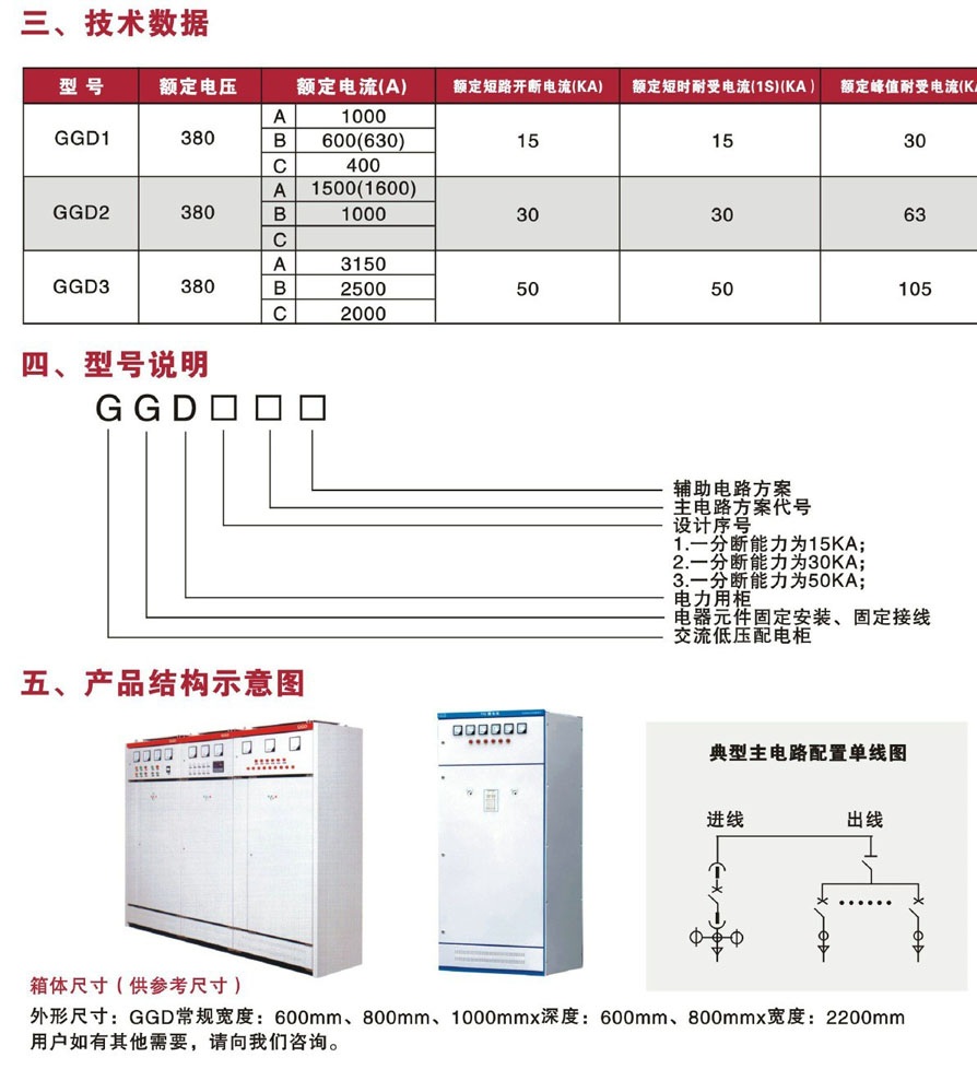 >固定封閉式開關柜GGD型交流低壓配電柜是根據能源部,廣大電力用戶在設計部門的要求,按照安全、經濟、合理、可靠的原則設計的新型低壓配電柜。本公司生產的GGD型交流低壓配電柜2008年通過國家強制性產品(CCC)認證,具有分斷能力高,動熱穩定性好,電氣方案靈活、組合方便,系列性,實用性強、結構新穎,防護等級高等特點。可作為低壓成套開關設備的更新換代產品使用。